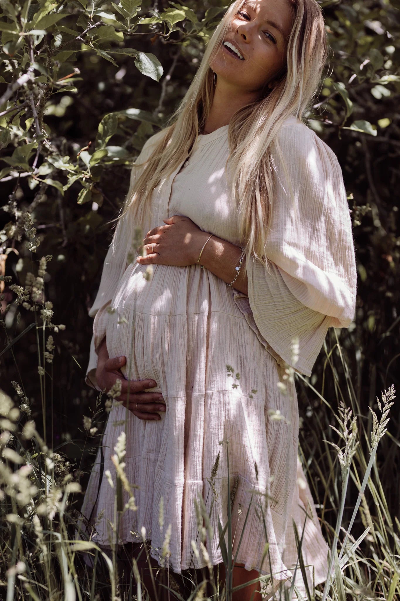 Feel beautiful throughout your days wearing our Cora maternity dress, made from soft cotton gauze. The material drapes so beautifully, letting our statement billowed sleeves stand out as a main feature.