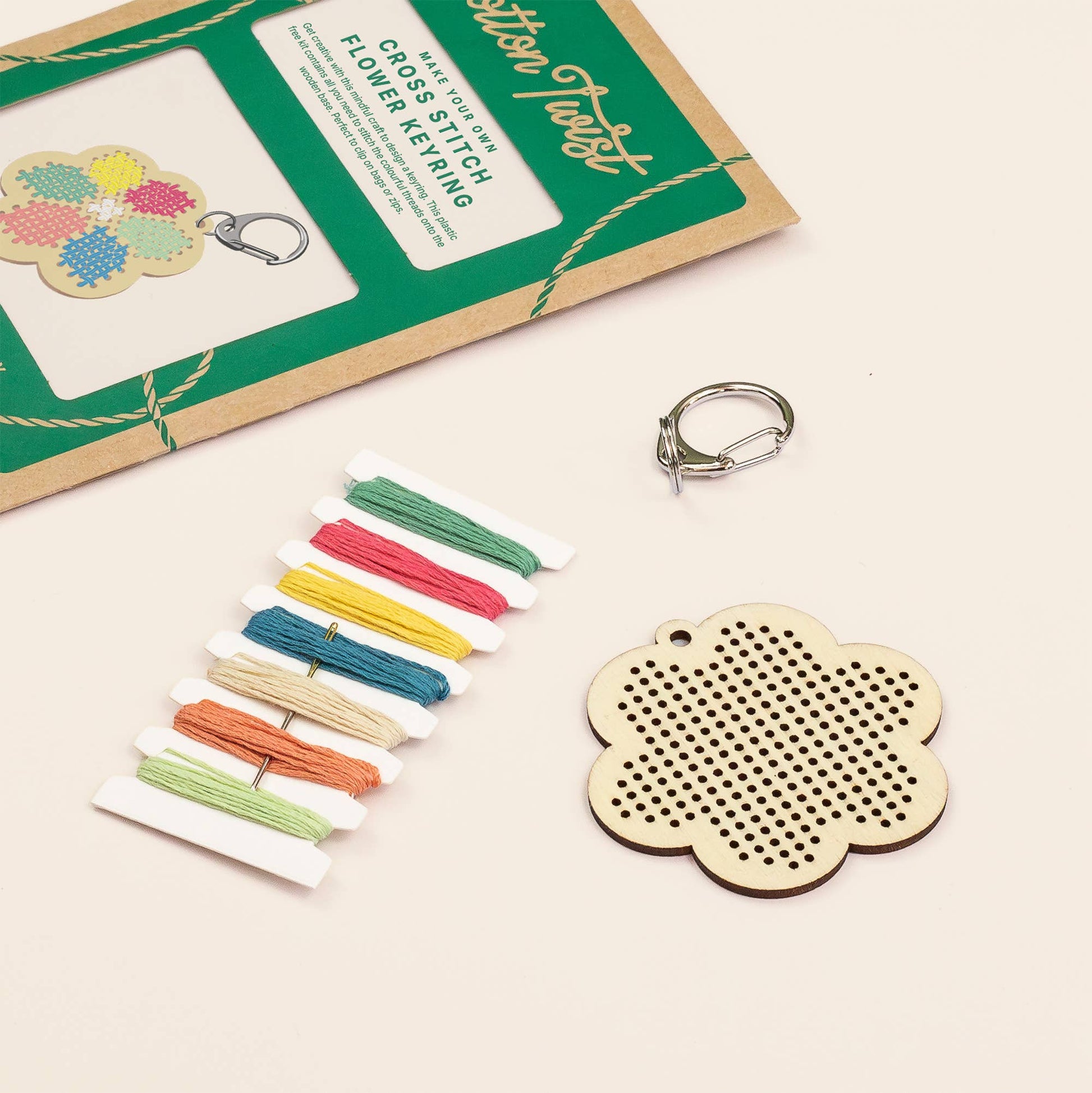 Introducing our Flower Cross Stitch Keyring kit! Inside each kit, you'll find a sturdy wooden flower ready to be stitched, a pack of pastel-coloured cotton threads and a durable metal embroidery needle.