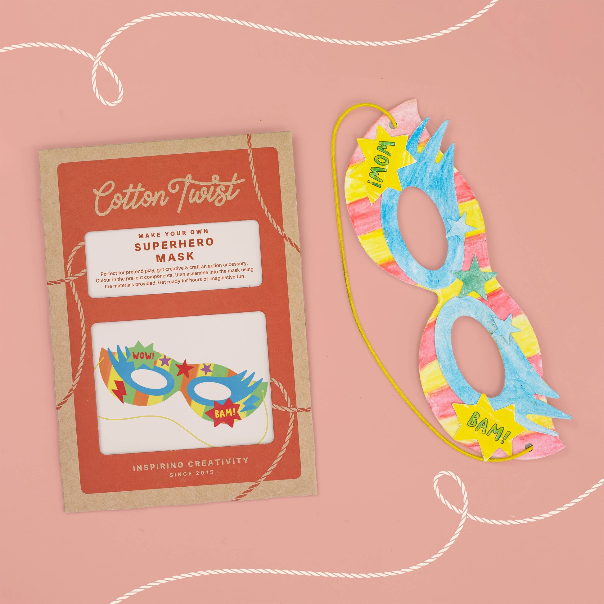 Children can use the mask base & cut-outs to embellish their masks and create their favourite superhero mask. Colour in your mask & accessories, attaching them with the glue dots, then it's time to show family & friends your special powers!