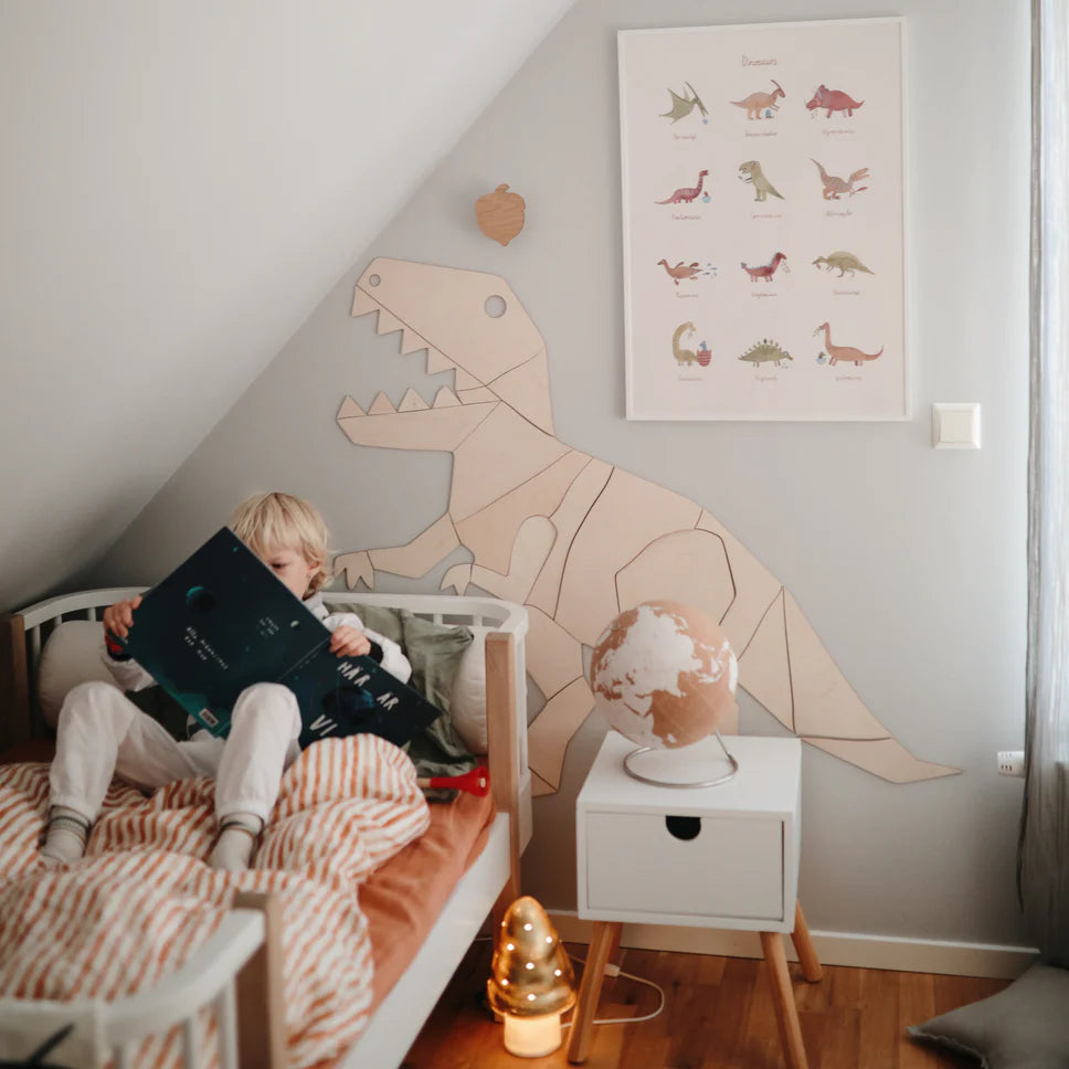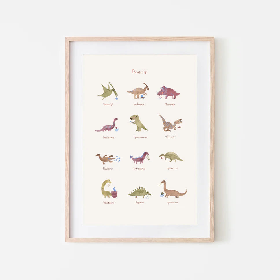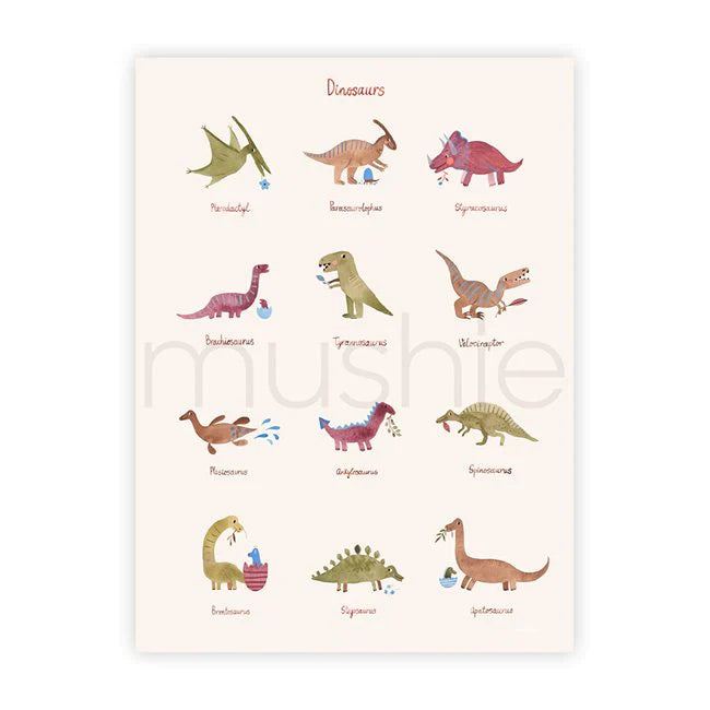 Help your child learn about dinosaurs with this charming, beautifully illustrated poster. Designed in Sweden, it's part of Mushie's series of prints that combine whimsical themes and soft colors with modern design.