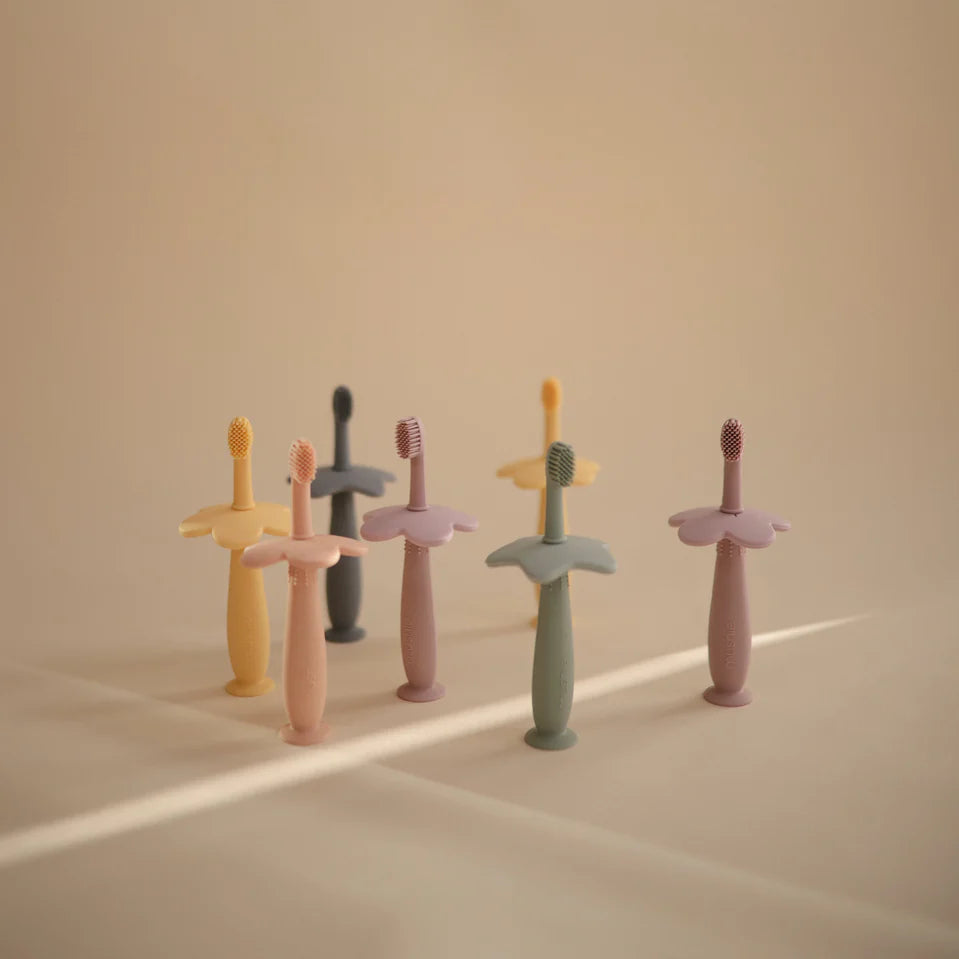 Available in soft colors, the toothbrush includes a silicone suction base for convenience and a removable flower-shaped safety guard to prevent gagging and choking, making the training toothbrush both safe and easy to use.