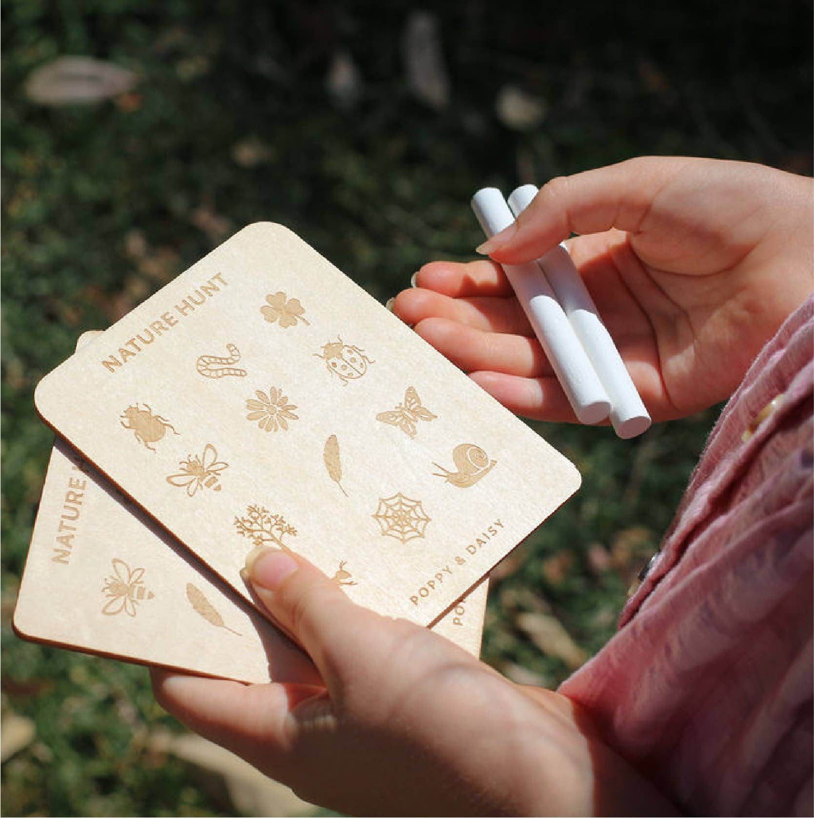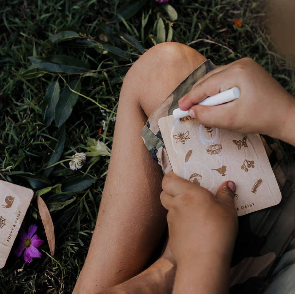 The Poppy and Daisy Designs Nature Hunt Mini Kit is a great way to inspire children to get out into the garden or go on a nature walk to hunt for some of natures beauty. Race against a sibling or friend to see who can tick off all their items on the board first. Hours of fun for children playing and learning about nature. Simply wipe with a wet cloth to play over and over as it's completely reusable. Fresh air, connecting with nature and keeping kids entertained! What more could you want? Presented in a calico bag with tag of Nature Hunt Boards picture on the front.