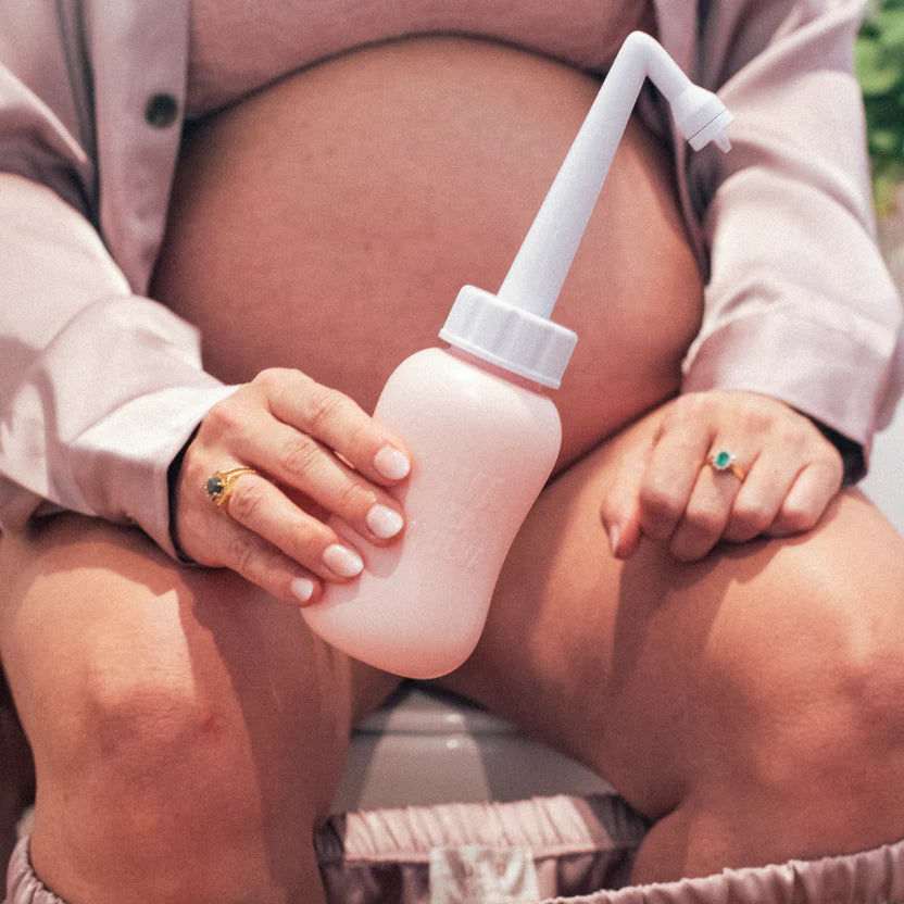 Sometimes wiping just isn’t an option and it stings to pee. Let’s face it, it’s FRAGILE AF down there! Your peri wash bottle helps dilute your urine to prevent stinging. We know it looks weird, but honestly, it will be one of your go-to-best-things-ever to take care of down there after baby is born. When toilet paper feels like sandpaper, use your peri wash bottle on your stitches or tears for the first couple of weeks following your birth. Your vagina and perineum are working double-time to repair themselves. Give them a little extra help by using our easy and portable postpartum cleansing peri wash bottle.