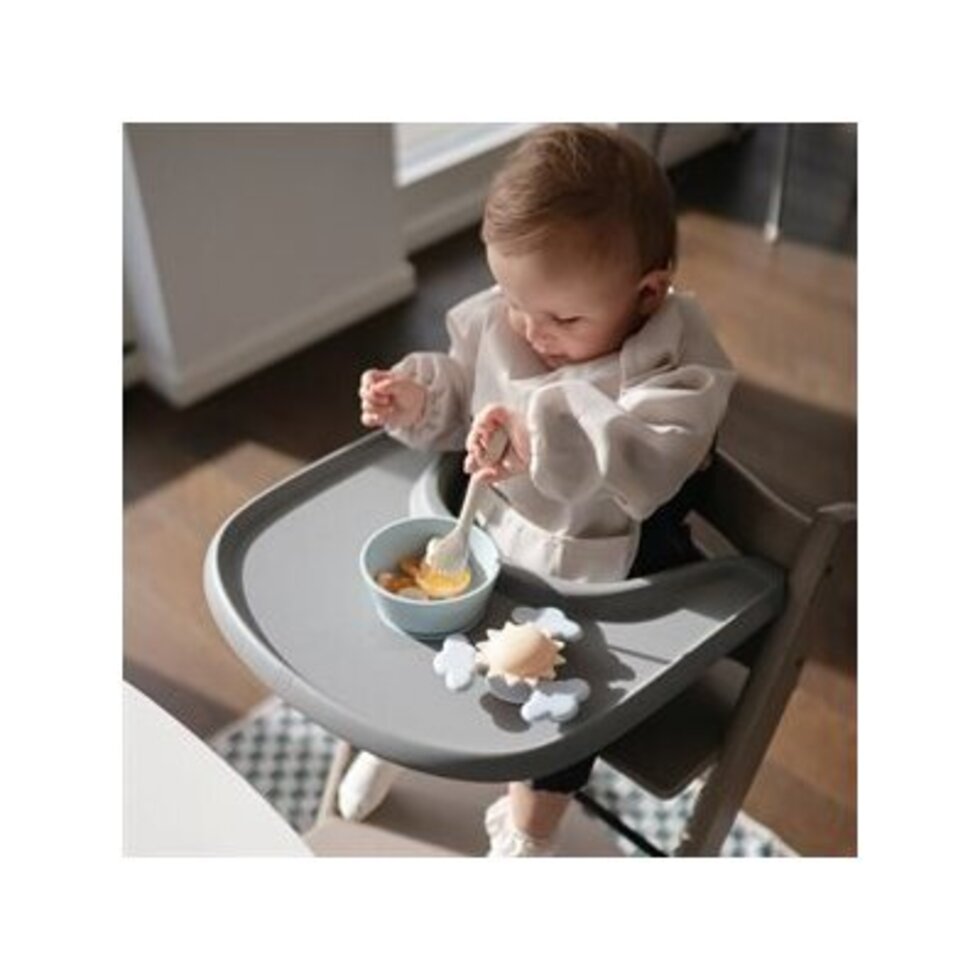 The toy is made from plastic and food-grade silicone and is designed to create sensory experiences for children. It also has a suction feature that ensures the spinner toy stays in place – this prevents accidental drops and encourages independent play. Try the suction feature on doors, chairs, in the bathtub etc.