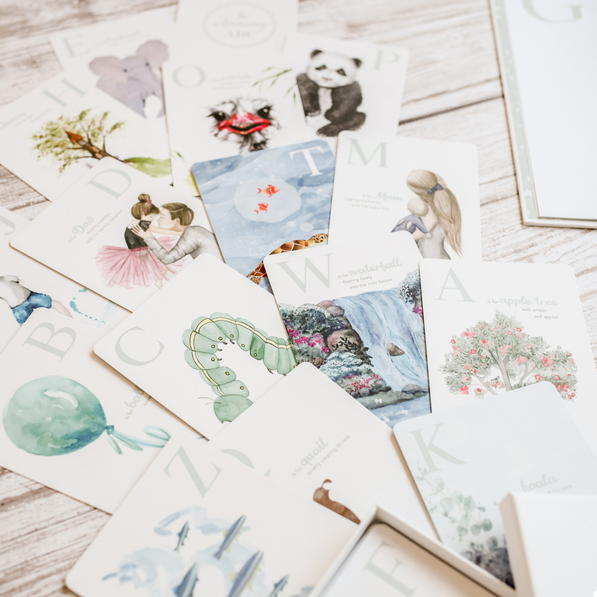The Amazing ABC Flash Cards are a fantastic learning tool for young children as well as featuring amazing watercolour artwork. Teachyour babes their ABC's with this collection of sweet words and illustrations created to engage and inspire your little loves imagination. A range of beautiful illustrations accompany words intended to engage young children and their imagination. These Flash Cards make a beautiful birthday, Christmas or just-because gift! You will never get tired of looking at these gorgeous illustrations and is sure to be the gift that keeps on giving. These Flash Cards are wonderfully gender-neutral which means no matter what your little one is interested in they will simply adore these Flash Cards!