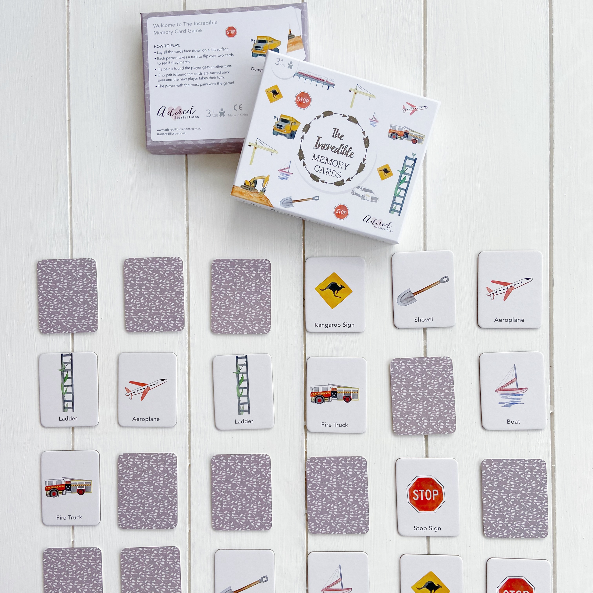 Welcome to The Incredible Memory Card Game! Featuring a world of all things transport for your little ones to enjoy! The Incredible Memory Card Game comes in a beautiful matt white hardcover box with charcoal foil on the lid making it that extra special. The beautiful artwork has been illustrated by Gold Coast Artist Lauren Hakavalu (and matches our stunning Incredible Puzzle).