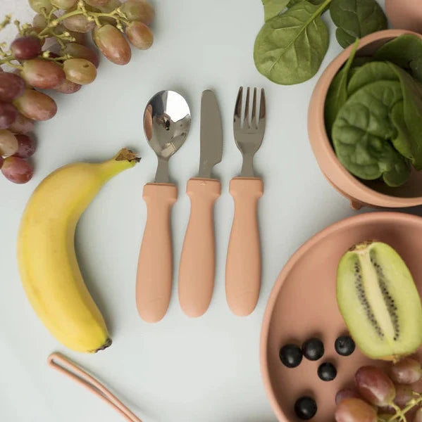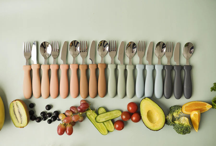 Ash & Co’s Three Piece Cutlery Set is the best switch from baby's cutlery to adult cutlery. The handles are made with 100% food grade silicone, grippy, and specifically created for small hands. The tops are made from 304 stainless steel and rounded to help protect young mouths.