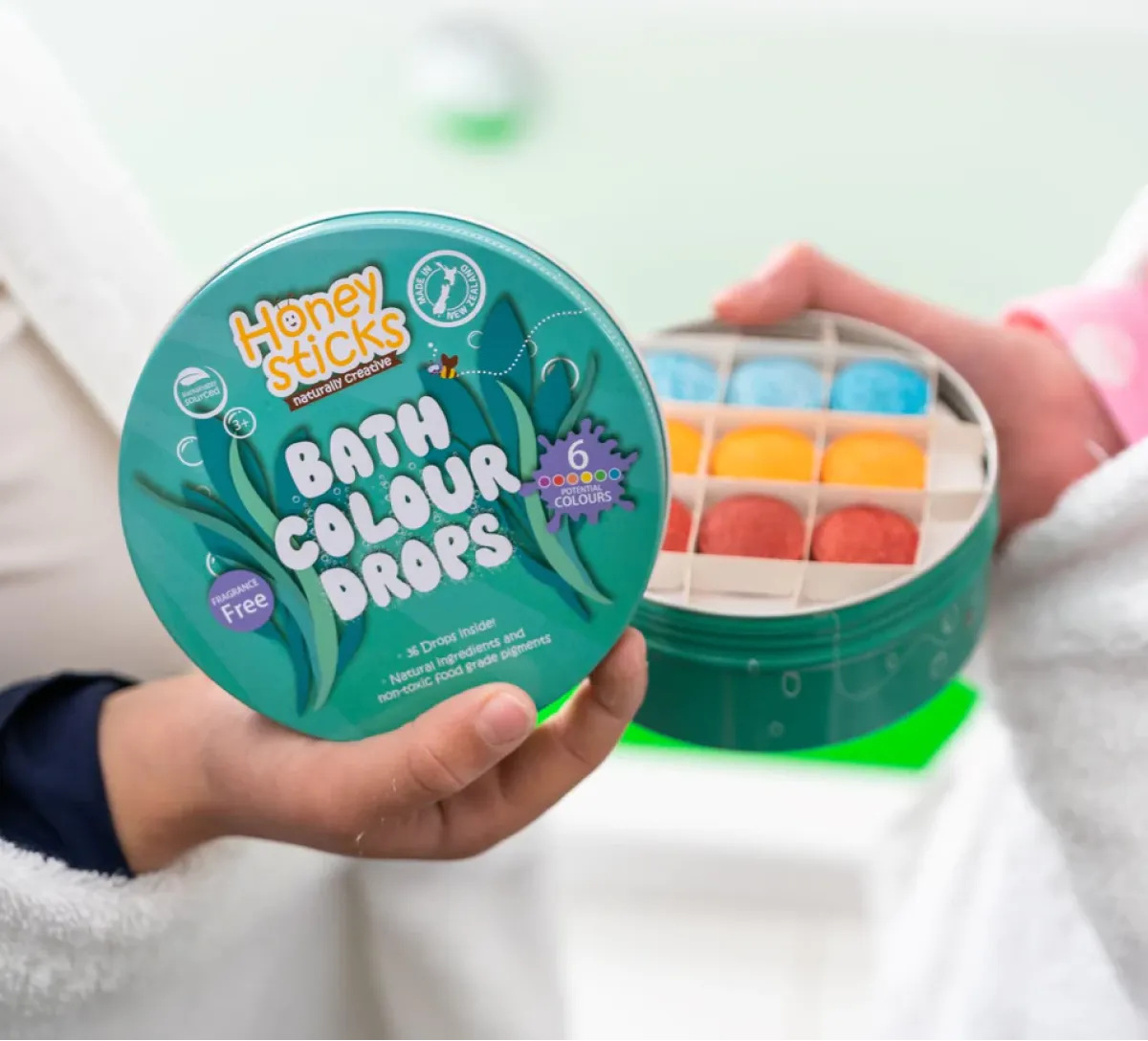 Sustainable product and packaging: Both Honeysticks Bath Crayons and Bath Drops are packed in eco-friendly tins for convenient storage. Our Bath Crayons are wrapped in a unique 'crushed rock' wrapper that is completely biodegradable.